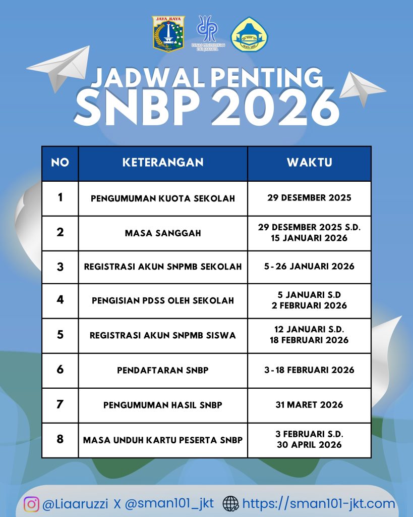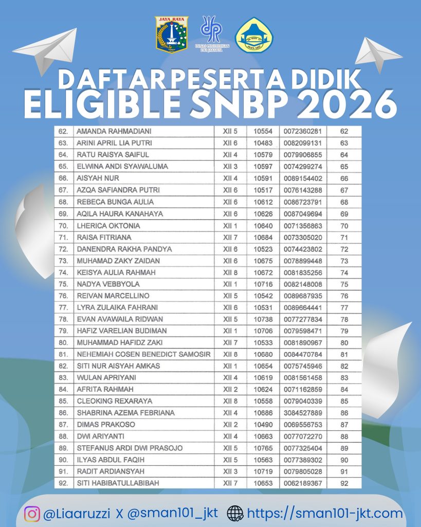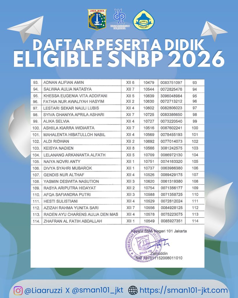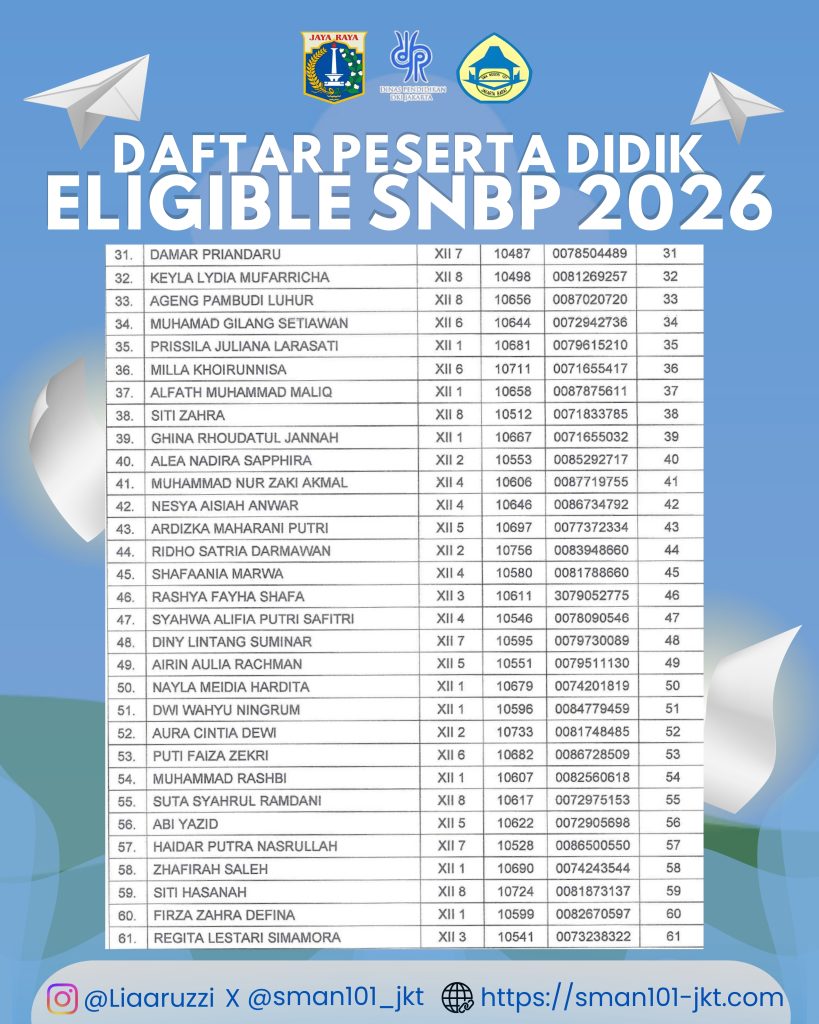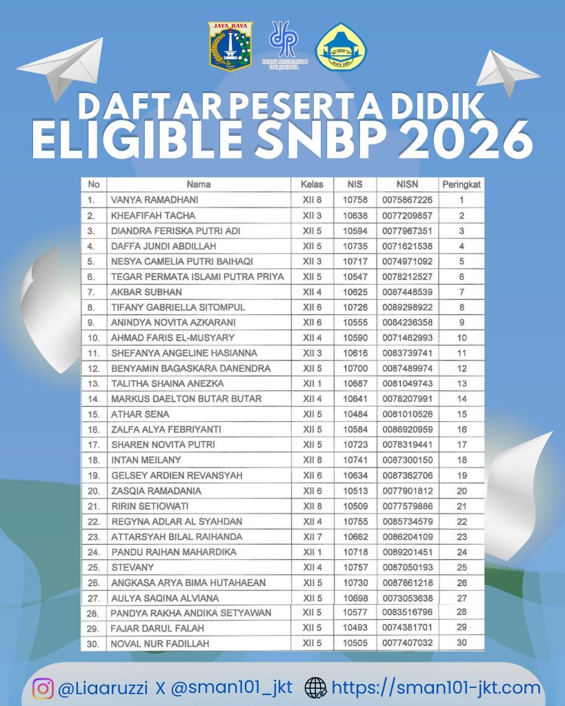 SMA Negeri 101 Jakarta dengan bangga mengumumkan Daftar Peserta Didik Eligible Seleksi Nasional Berdasarkan Prestasi (SNBP) Tahun 2026. Penetapan peserta didik eligible ini merupakan hasil dari proses pemeringkatan berdasarkan ketentuan yang berlaku dalam sistem SNPMB.