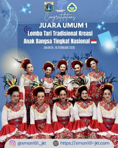 Jakarta, 16 Februari 2026 — Prestasi membanggakan kembali diraih peserta didik SMAN 101 Jakarta. Tim Arkana Dance sukses menyabet Juara 1 Tingkat Nasional dalam ajang Lomba Tari Kreasi Nusantara – Pentas Seni Kreasi Anak Bangsa yang digelar di Plaza Kalibata.
